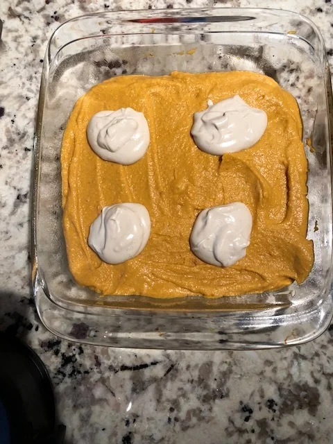 Scoop out tbsp sized amounts of “cheesecake” filling and drop them on to the pumpkin mixture. Approx 4-6 scoops.