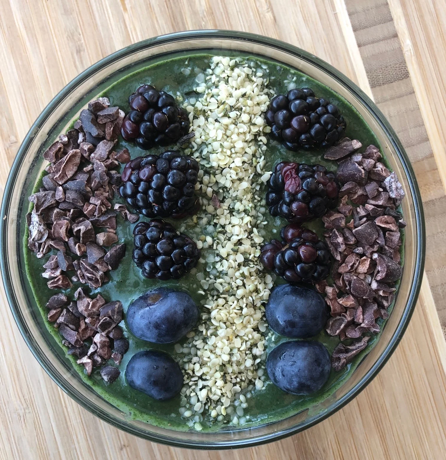 Toppings: blueberries, cacao nibs & blackberries & hemp seeds